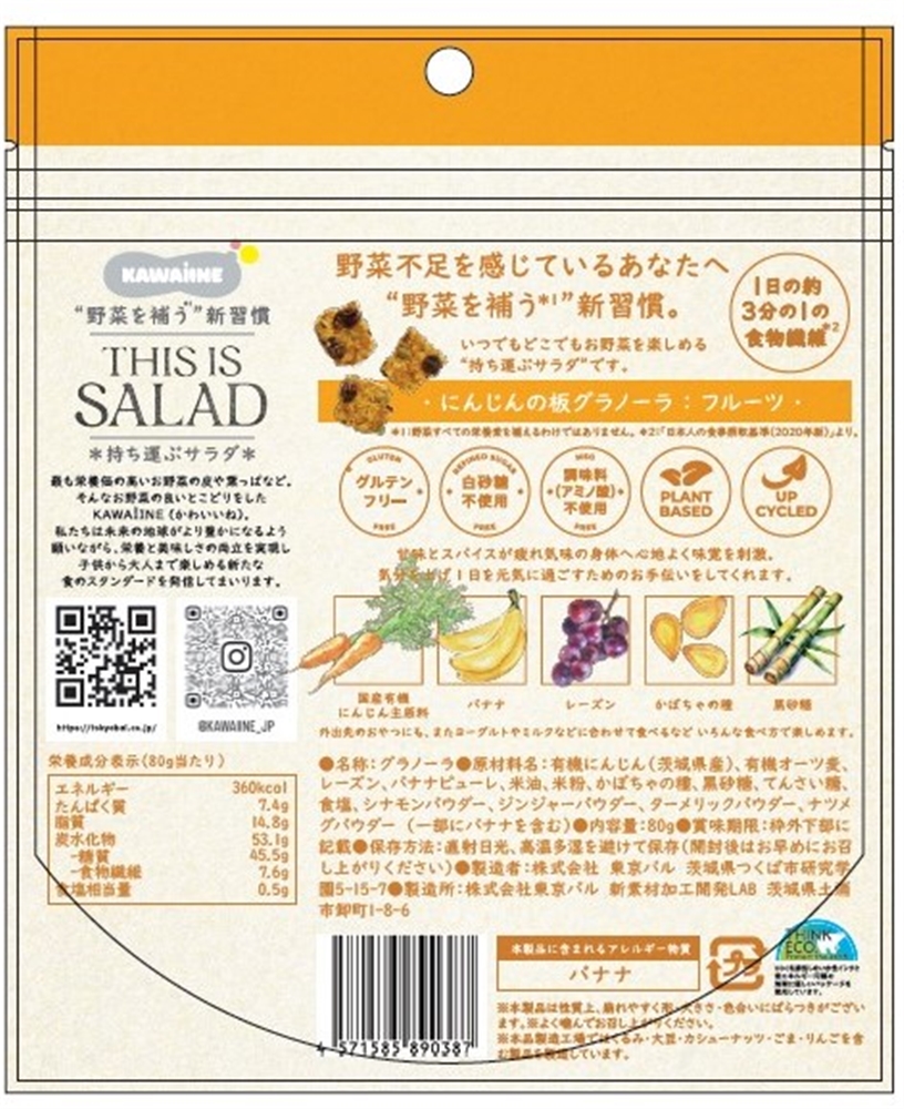 - 有機にんじん(茨城県産)、有機オーツ麦(アメリカ)、レーズン(アメリカ)、バナナピューレ(フィリピン)、米油(日本)、米粉(日本)、かぼちゃの種(中国)、黒砂糖(日本)、てんさい糖(日本)、食塩(日本)、シナモンパウダー(マレーシア)、ジンジャーパウダー(中国)、ターメリックパウダー(マレーシア)、ナツメグパウダー(インドネシア)