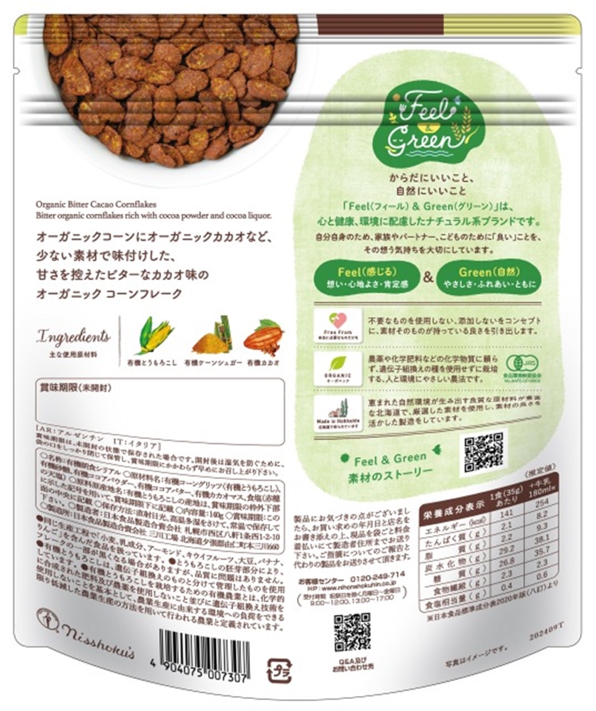 - 有機コーングリッツ(有機とうもろこし)、有機砂糖、有機ココアパウダー、有機ココアバター、有機カカオマス、食塩(赤穂の天塩)