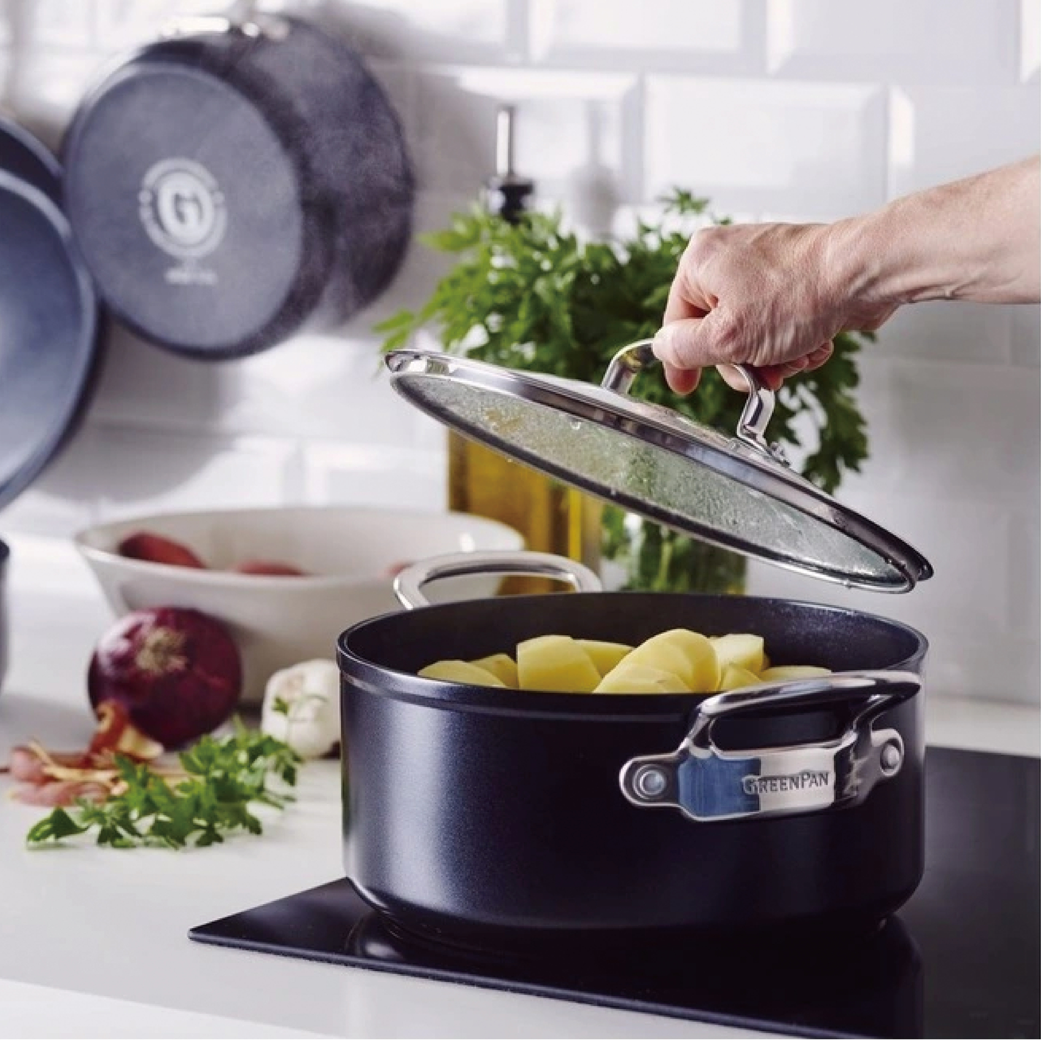 ●材質 [本体]:アルミニウム合金 [底面]:金属溶射構造 [ハンドル]:ステンレス鋼 [蓋]:強化ガラス(前面物理強化)・ステンレス鋼