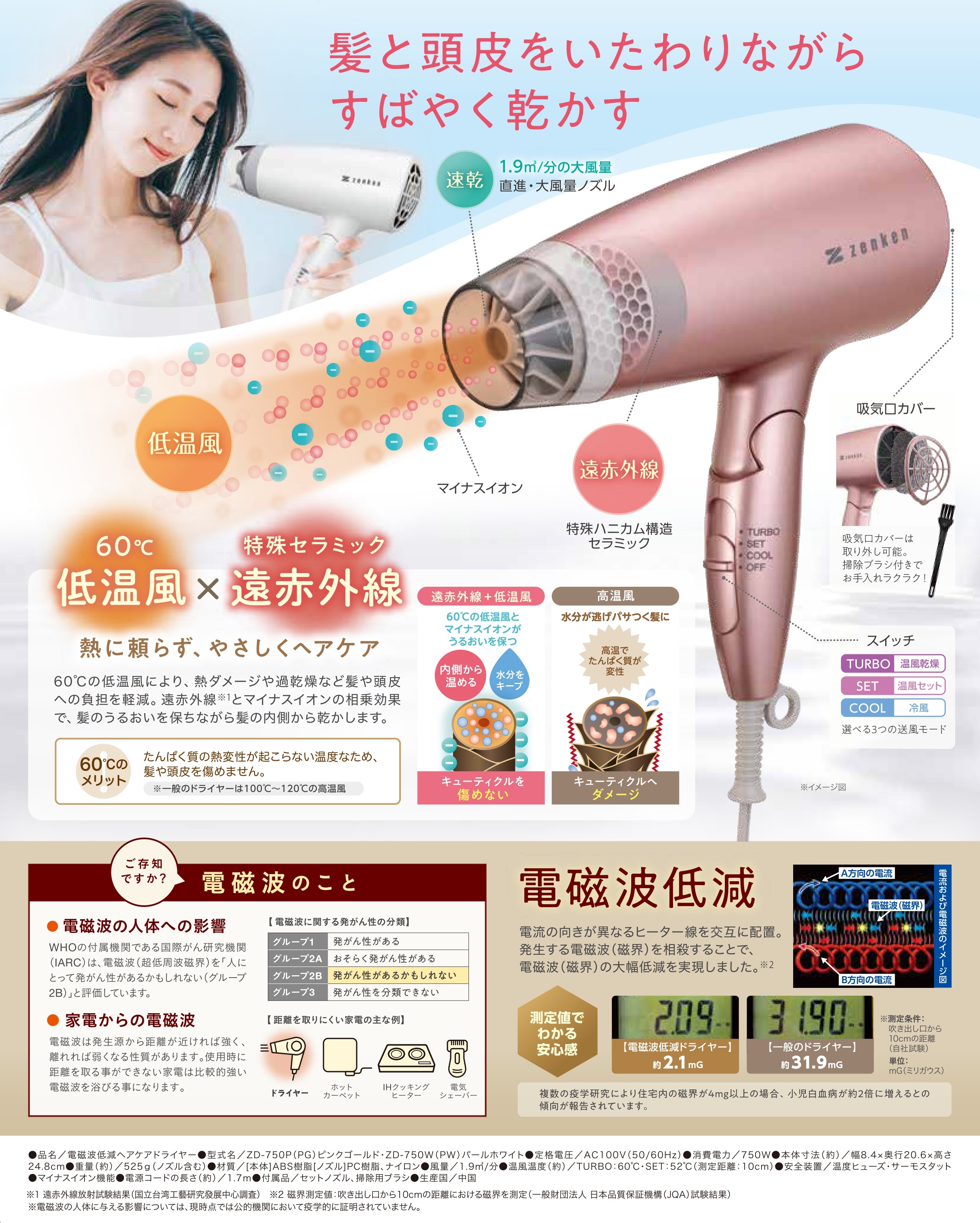 ●温風温度 (約) TURBO:(強温風)約63℃・SET:(弱温風)約52℃・COOL:(冷風)約30℃(室内24℃の場合)
