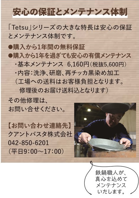 表面(鉄分子)にチッソ(窒素)を拡散させ鉄表層の性質を変えること(チッカ黒染め加工)で、鉄鍋の表面の強度を高め(鉄の約7倍)、錆びにくい性質(油引きも不要)を持たせました。通常のコーティングと違い調理時に付着した鉄分も安全に摂取できるため鉄不足も補えます。