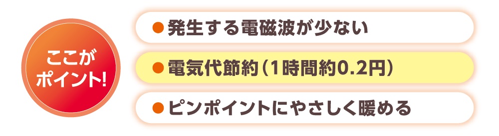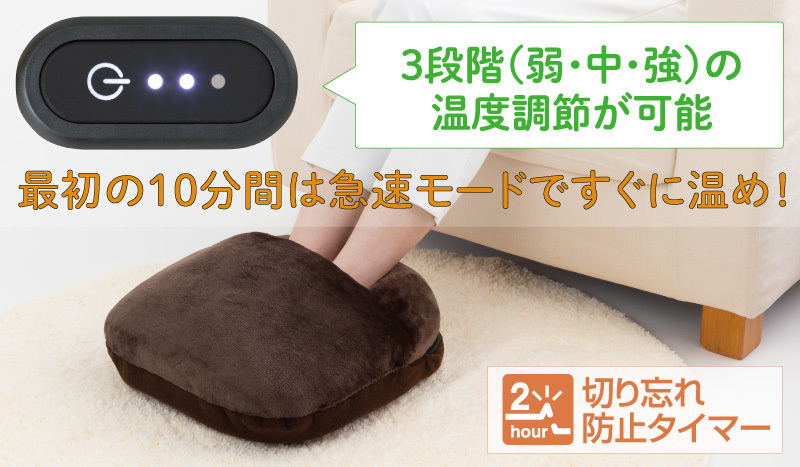 自動運転モードを搭載。最初の10分間は速暖モードで急速に温め、その後、強運転に切り替えます。