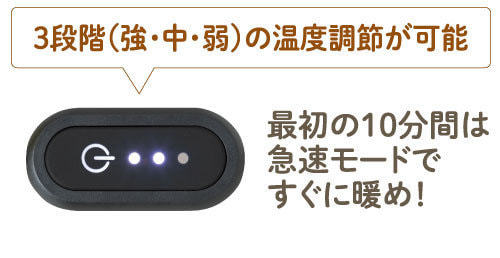 自動運転モードを搭載。最初の10分間は速暖モードで急速に暖め、その後、強運転に切り替えます。切り忘れ防止タイマー付きで安心です。